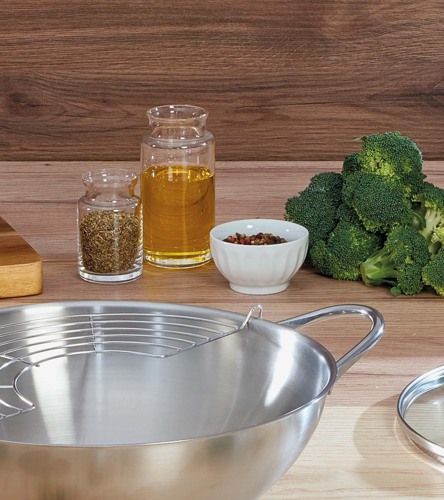 Equipped with a half-moon shaped grid and a lid with aroma system that allows liquids to be poured with the right dosage directly into the knob, without lifting it. In this way, water, broth, wine, etc. falls one drop at a time onto the food while maintaining the right moisture. Ideal for sautéing and seasoning pasta, for soups and risottos, cooking vegetables, stewing meat and frying.