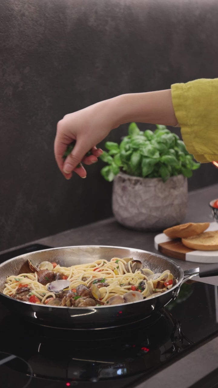 La linea 33 Carati inox è un gioiello in cucina. Le padelle, impreziosite da un manico ergonomico in silicone, sono ideali per le lunghe cotture, per friggere o per pietanze in umido. Adatte a tutti i piani di cottura, induzione compresa. Set composto da: padella ø cm 24 - wok ø cm 28
