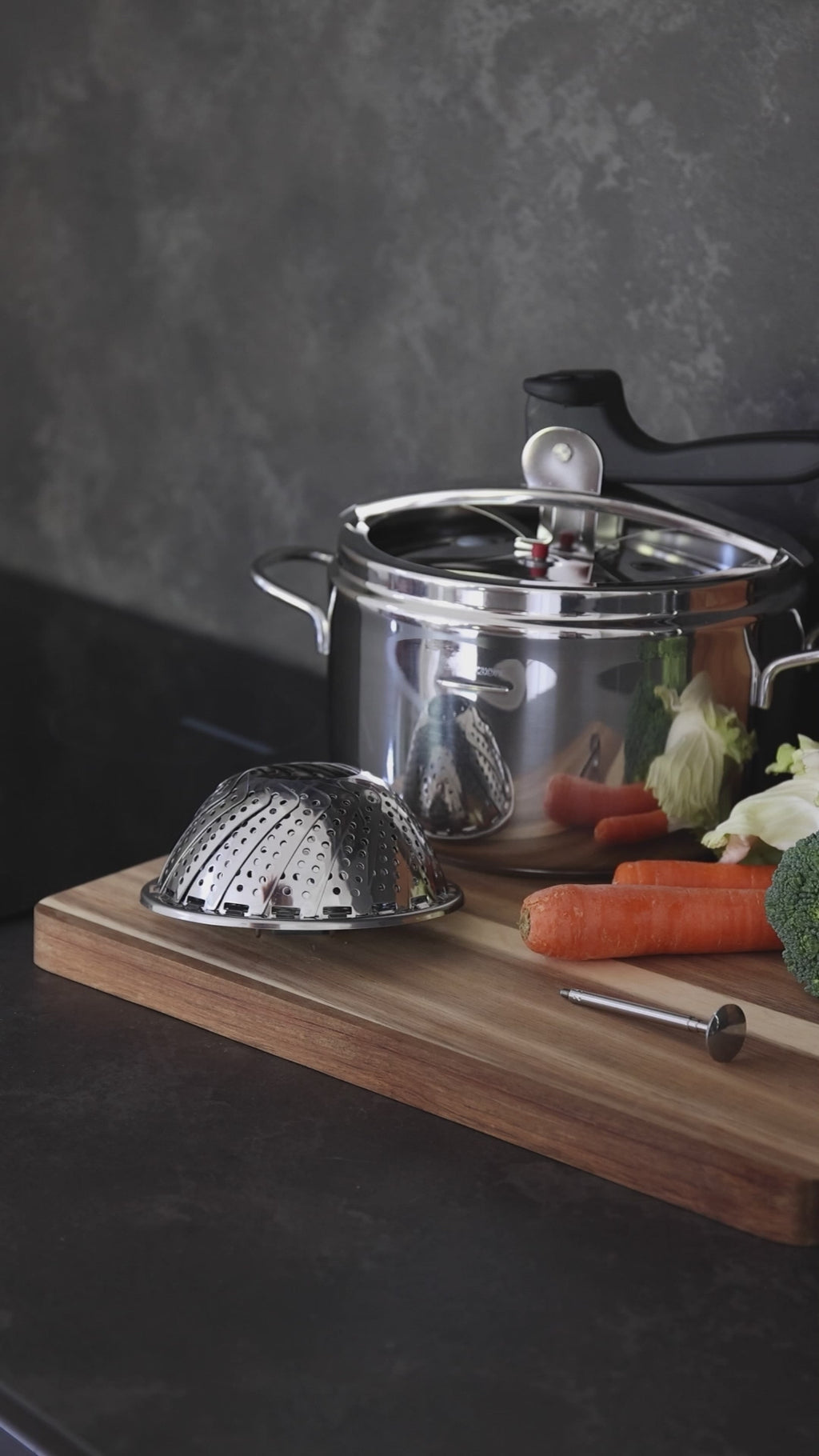 L'apertura a fiore ed il manico telescopico lo rendono di comodo utilizzo, perfetto per la cottura a vapore sia in pentola a pressione sia in vaporiera. Salva spazio.