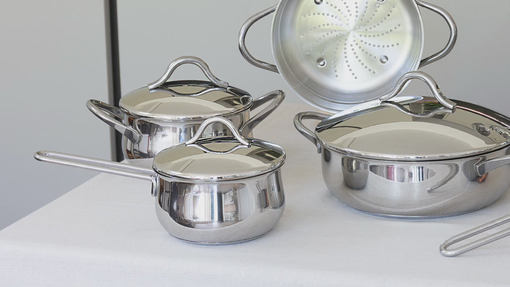 Una batteria completa pensata per fornire tutti gli strumenti per cucinare e servire. Caratterizzata dalla forma bombata, la batteria è adatta a tutti i piani di cottura, compresa l'induzione. Batteria composta da: pentola ø cm 20/24 - casseruola ø cm 16/20/24 - tegame ø cm 24 - casseruola manico lungo ø cm 14 - vapo cuoci ø cm 20 - colino ø cm 14 - bollilatte ø cm 12 - coperchio ø cm 14/16/20 (x2)/24 (x3) - set mestoli 6 pezzi - detergente universale