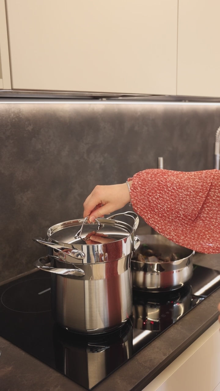 My Lady, la linea top di gamma, possiede un mix tra design e tecnologia unico nel suo genere. Le sue linee morbide si coniugano con uno spessore dell'acciaio di 1,2 mm. Lo spaghettiere è lo strumento professionale per la cottura della pasta dotato di uno cestello forato che, oltre a garantire una scolatura facile e veloce, permette una sana cottura al vapore. Adatta a tutti i piani di cottura, anche all'induzione.